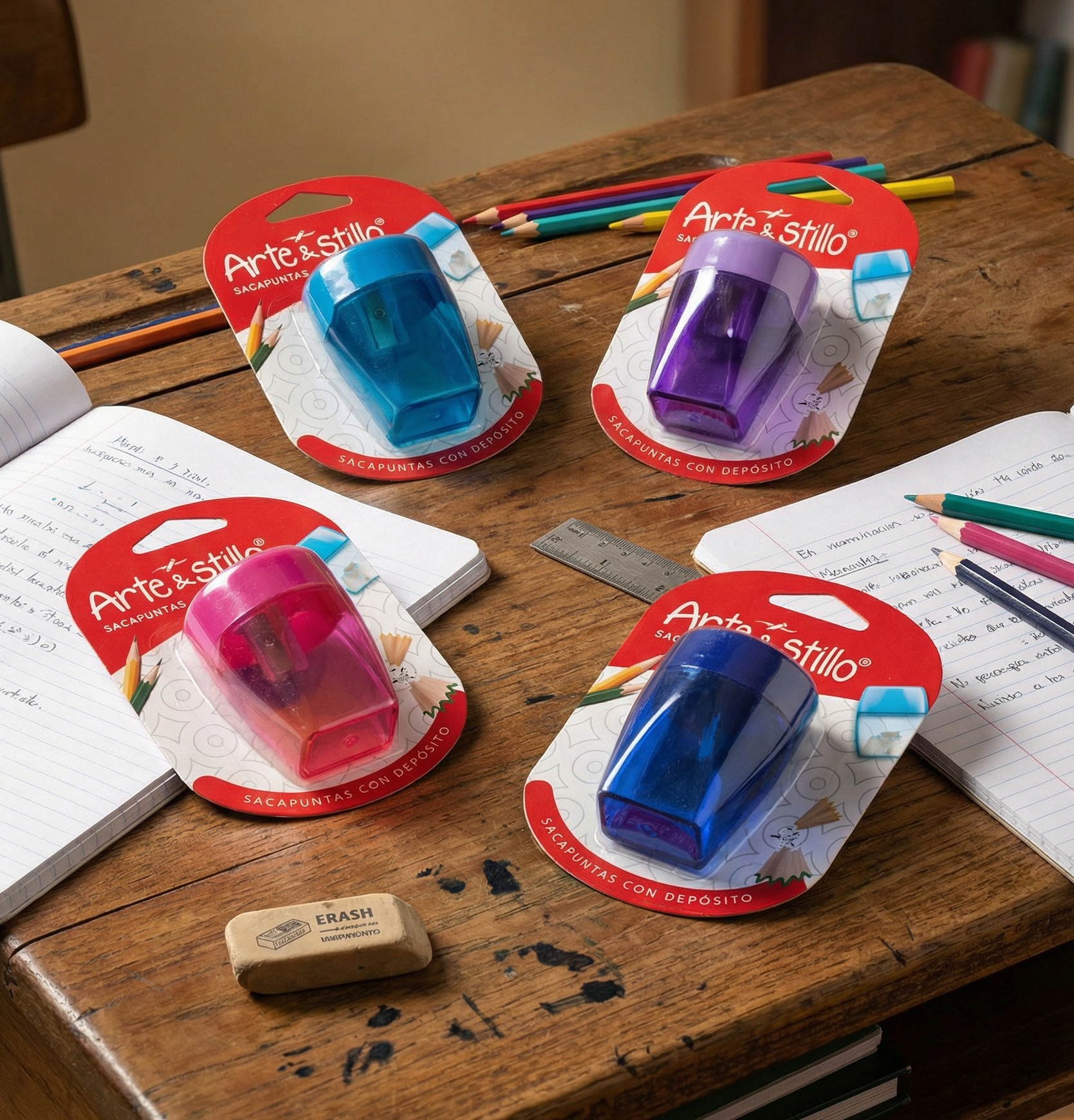 Sacapuntas Arte & Stillo® – violeta, celeste, rojo, verde- 12.5×8.4cm